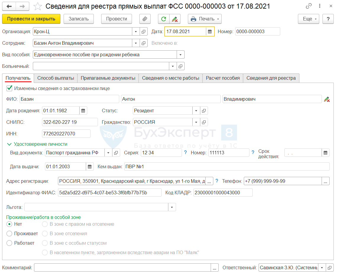 - В форме реестра во вкладке «Получатель» будут сформированы данные сотрудника.