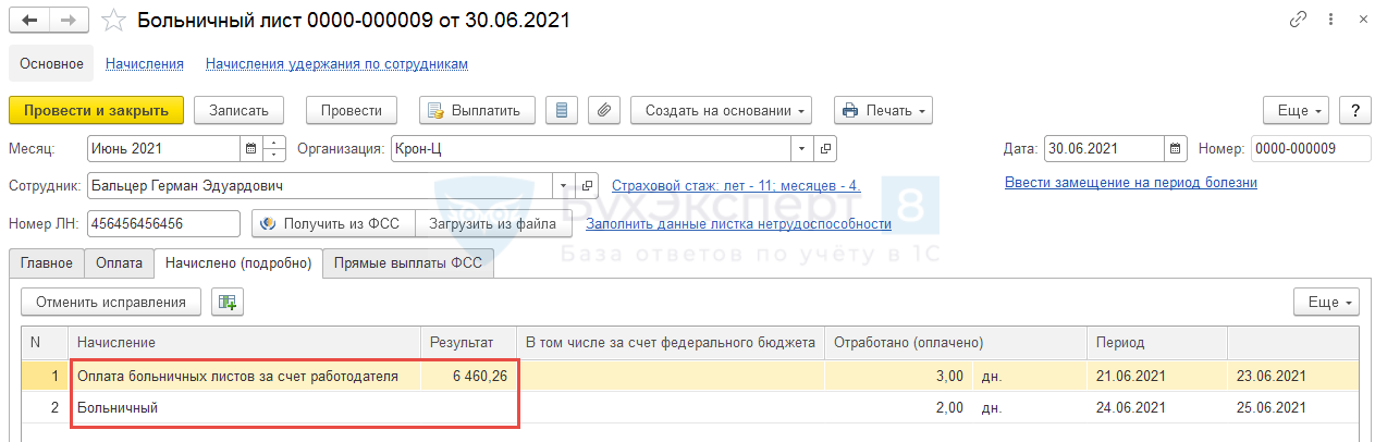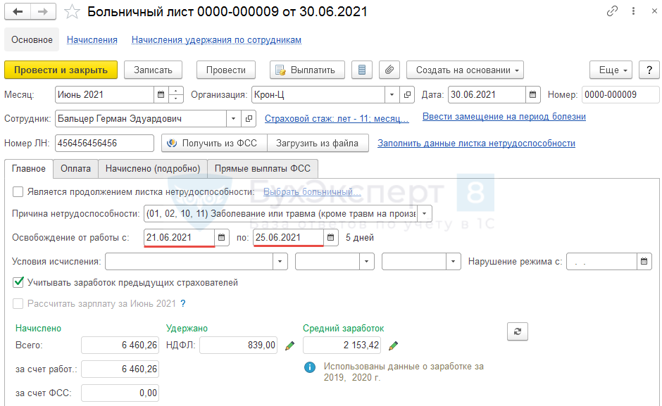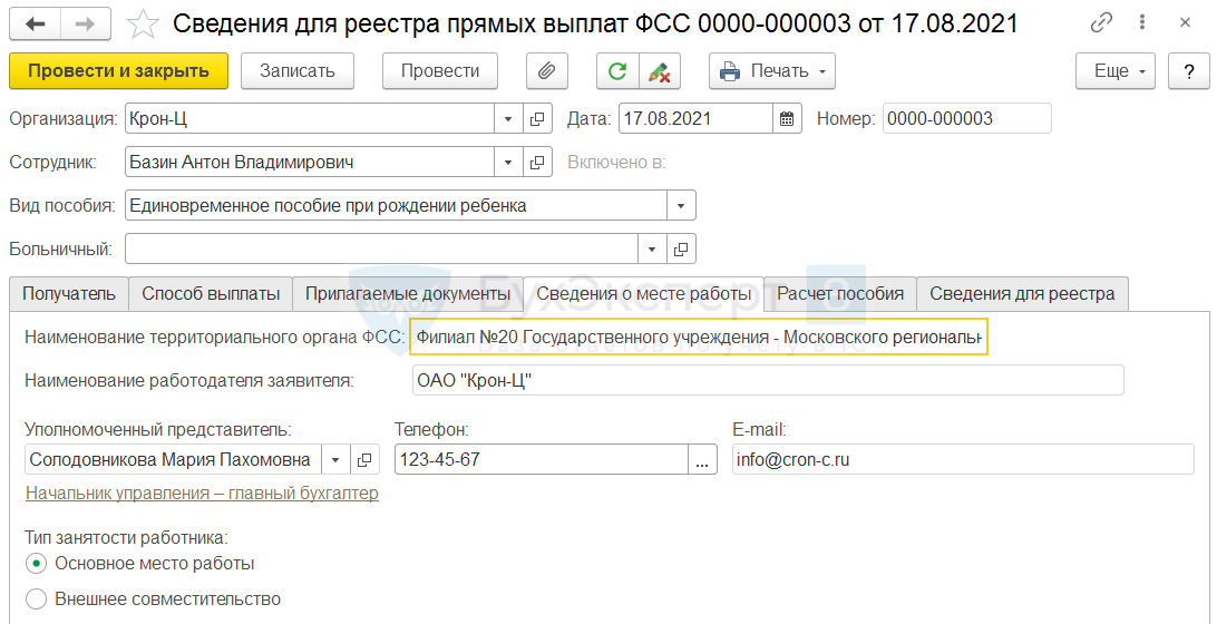 Вкладки документа автоматически заполнятся данными сотрудника.