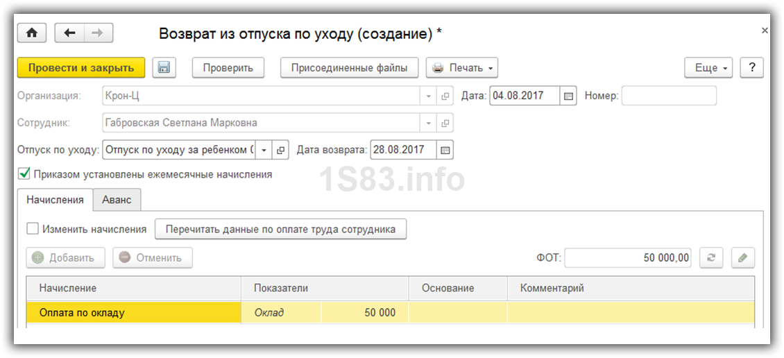 Вам остается только уточнить текущие начисления: оставить прежними или изменить. Когда вы заполните все данные, проведите документ.
