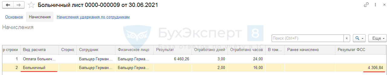 В документе Начисление зарплаты и взносов произойдет следующий расчет Доплаты до оклада на период больничного :
