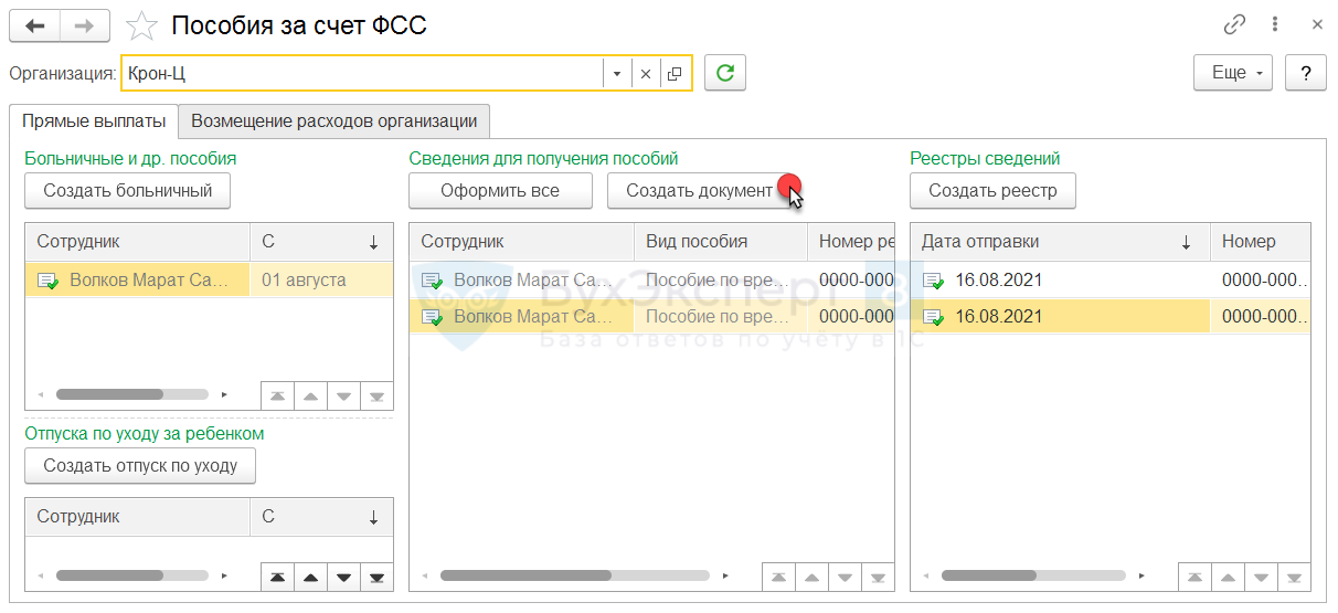 Создать документ Сведения для реестра прямых выплат ФСС можно в разделе Отчетность, справки – Пособия за счет ФСС — Сведения для получения пособий по кнопке Создать документ: