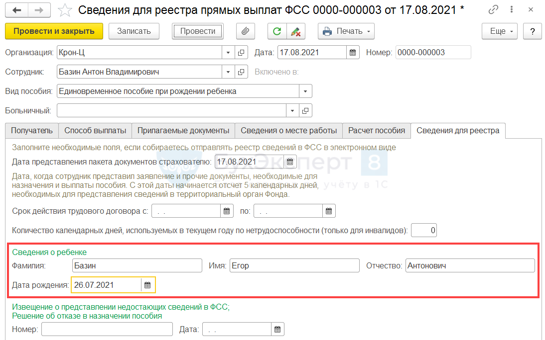 Если реестр сведений в ФСС планируется отправлять в электронном виде, то нужно также заполнить раздел Сведения о ребенке на вкладке Сведения для реестра