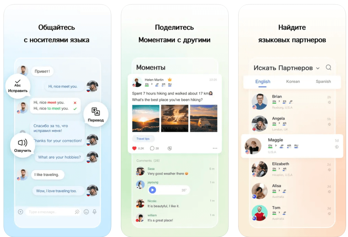 - HelloTalk – более 150 языков для изучения, языковое сообщество, есть приложение для знакомств, что часто мешает обучению.