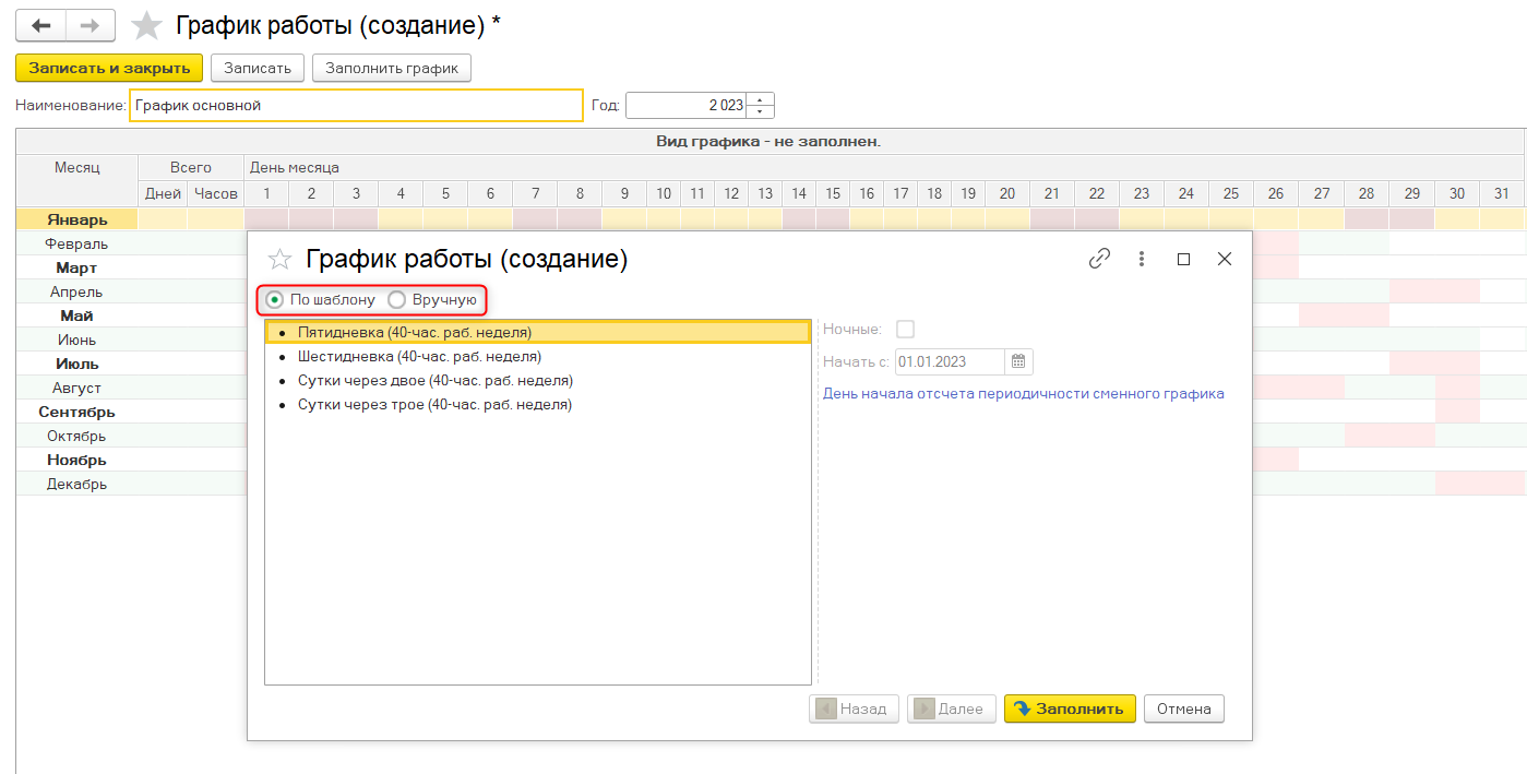 Установить способ заполнения графика Вручную, затем нажать кнопку Далее.