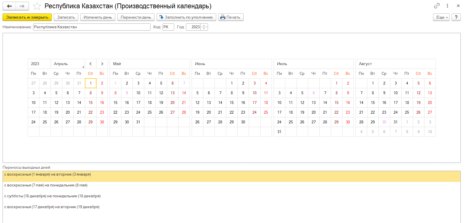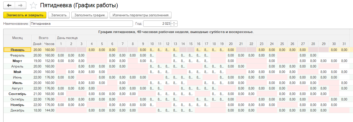 Перед созданием графиков работы заполняется Производственный календарь, который хранит данные по рабочим, праздничным и выходным дням.