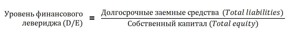 Соотношение D/E показывает степень финансирования деятельности компании за счет заемных средств по сравнению с ее собственными фондами, а также помогает оценить способность акционерного капитала покрыть все непогашенные долги в случае экономического спада.
