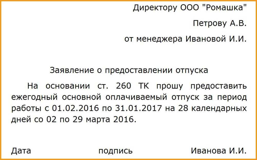 Заявление о предоставлении отпуска на основании ст. 260 ТК