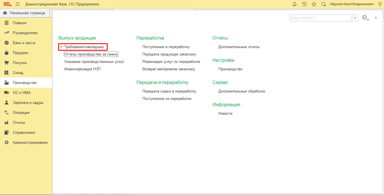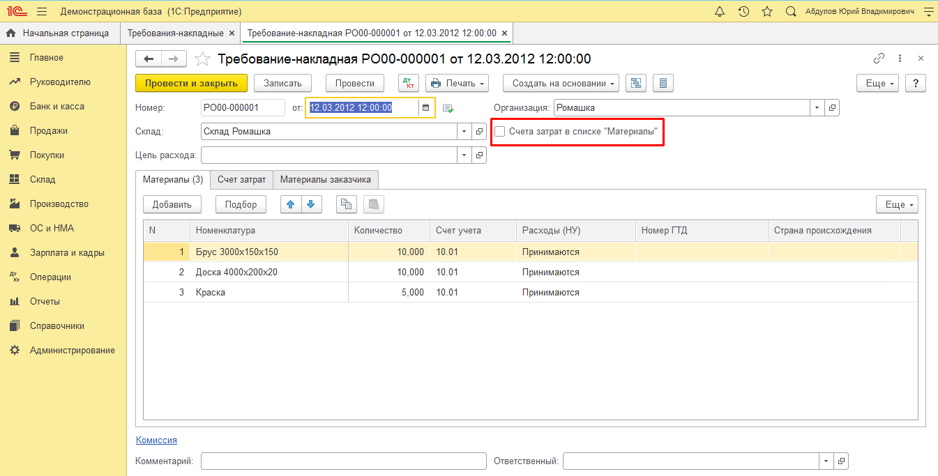 Документ “Требование-накладная” позволяет также списать материалы. Он находится в меню “Производство-Требование-накладные”