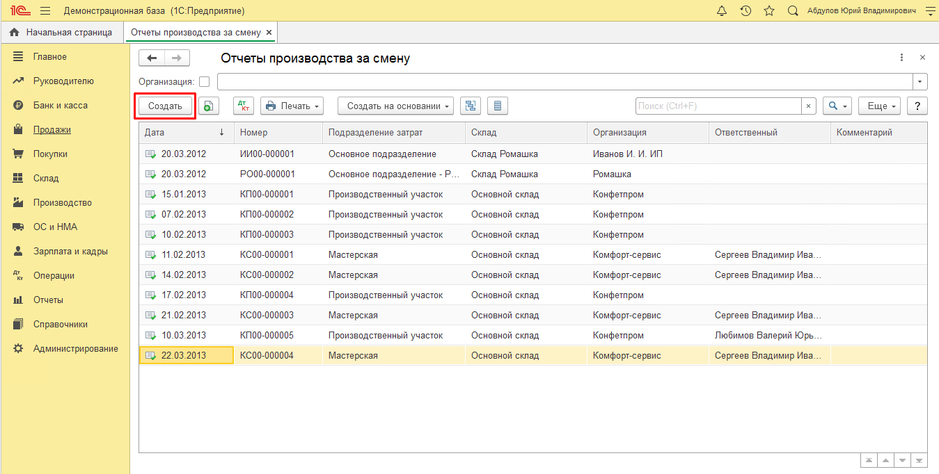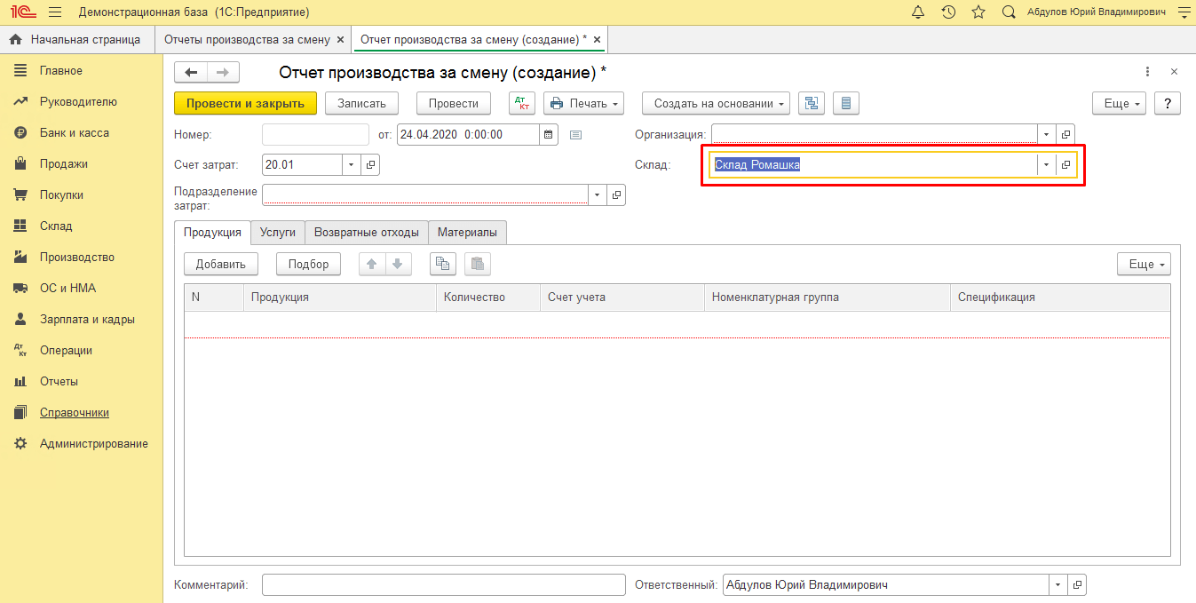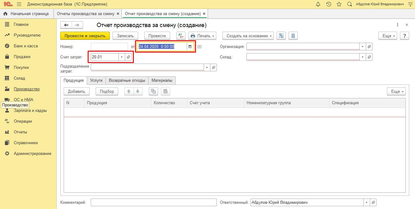 Данный этап производится после того, как приобретается сырье, материалы и списываются на производство. Перейдем к оформлению выпуска в меню “Производство-Отчет производства за смену”.
