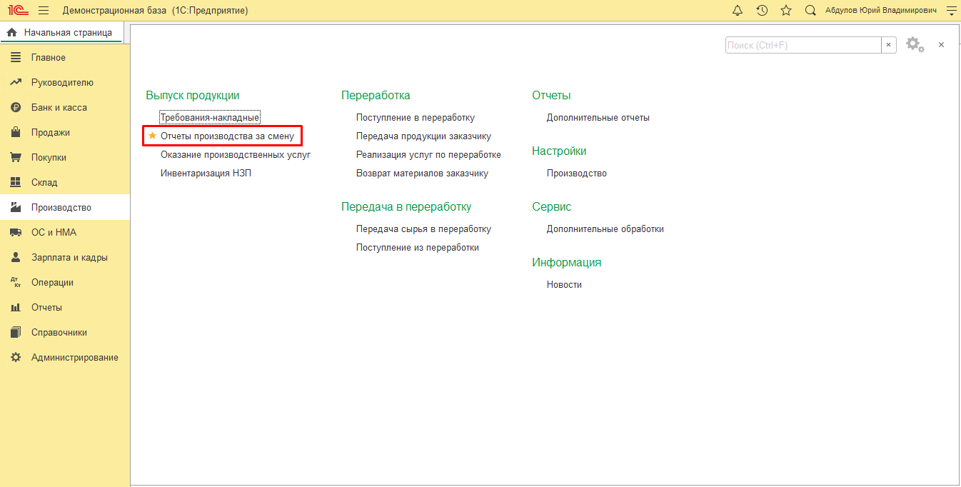 Программа «1С» позволяет осуществлять ежедневный учет выпуска продукции посредством документа «Отчет за смену» (доступен в разделе «Производство»). Данный инструмент автоматически сформирует необходимые проводки с использованием корреспонденций основных счетов, применяемых в целях учета готовой продукции: 43, 40, 20.