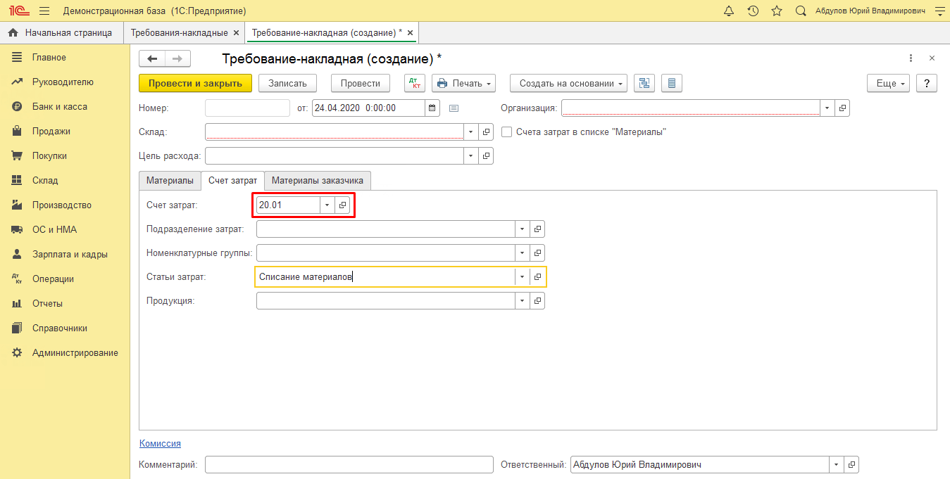 Необходимо внести дату, название склада и вкладку материалы с указанным количеством израсходованного материала.