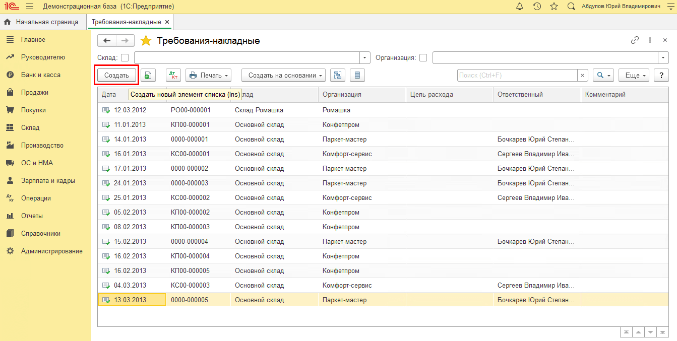 Приступаем к созданию в журнале регистраций требований-накладных.