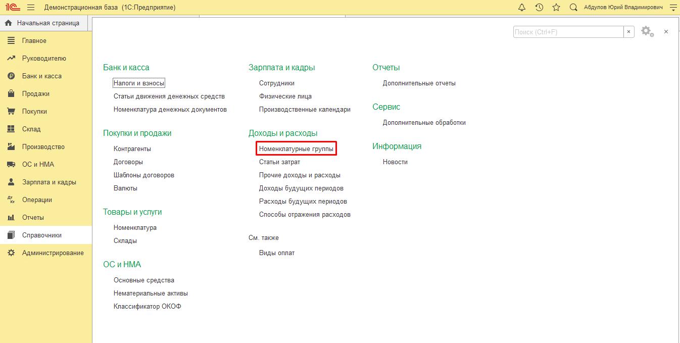 Для этого вновь заходим в раздел «Справочники» пункт «Номенклатура»: