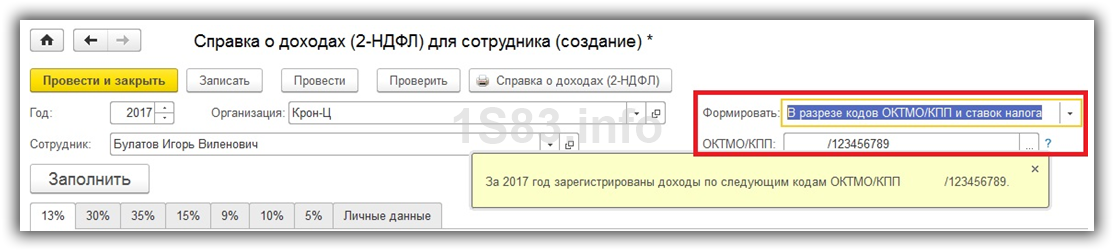 В том случае, когда вам в 1С 8.3 необходимо формировать данную справку в разрезе кодов ОКТМО/КПП и ставок налога, укажите это в реквизите «Формировать». В данной ситуации нужно выбрать верное значение в поле «ОКТМО/КПП», которое расположено ниже.