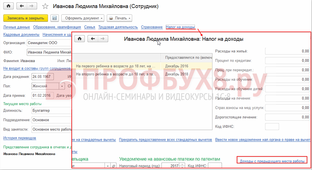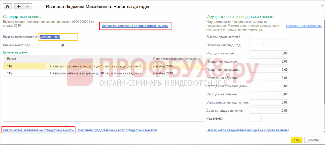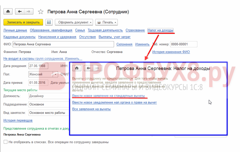 А также можно из карточки сотрудника перейти по гиперссылке Налог на доходы и выбрать ссылку Ввести новое заявление на стандартные вычеты: