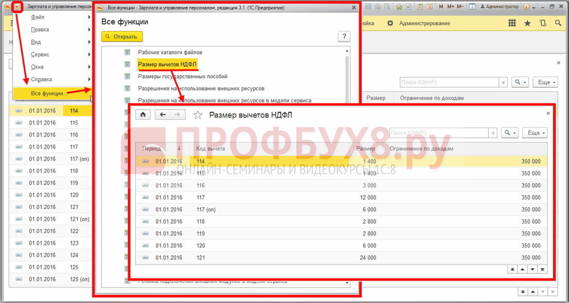 Общий регистр сведений под названием размер вычетов НДФЛ несет в себе информацию про величину вычета с подоходного, гранично допустимые рамки, ограничивающие применение вычета и число начала его применения. Найти эту команду Вы сможете в любой из функций.