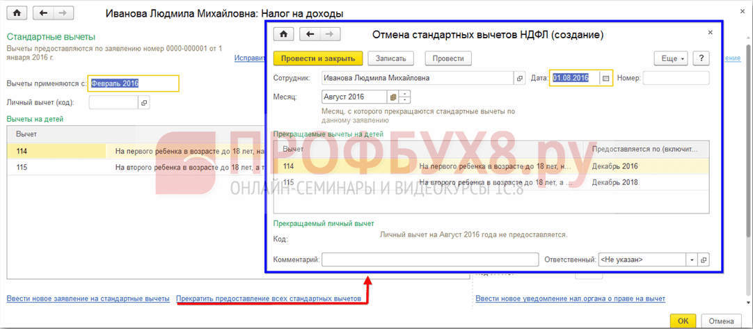 Прекращение стандартных вычетов в 1С ЗУП 8.3