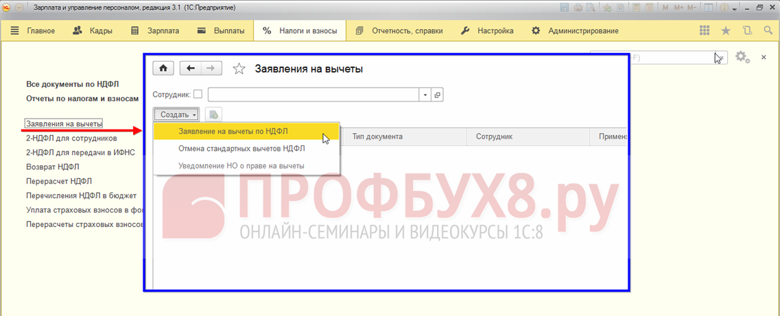 Зарегистрировать право на вычет в 1С ЗУП 8.3 можно в разделе Налоги и взносы, далее Заявление на вычеты и выбрать Заявление на вычет по НДФЛ: