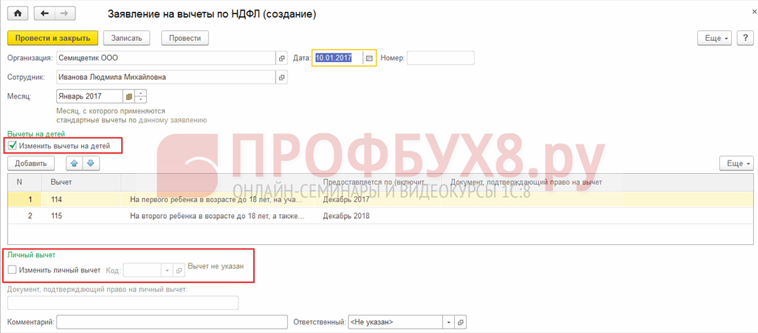 - При выборе сотрудника документ автоматически заполняется всеми имеющимися стандартными вычетами по сотруднику. Если создаётся из карточки сотрудника, документ автоматически полностью заполнен;
