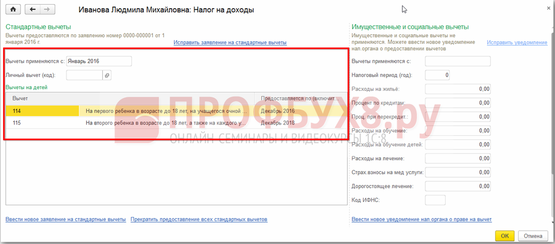 Установить применение налоговых вычетов в 1С ЗУП 8.3 можно: