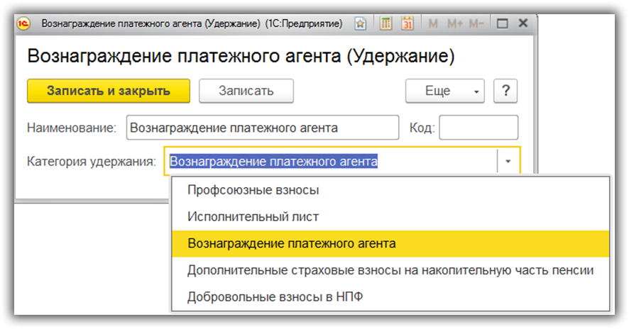 Наименование можно указать произвольно, категорию удержания выбирают из выпадающего списка. Для вознаграждения агента здесь есть специальная категория.