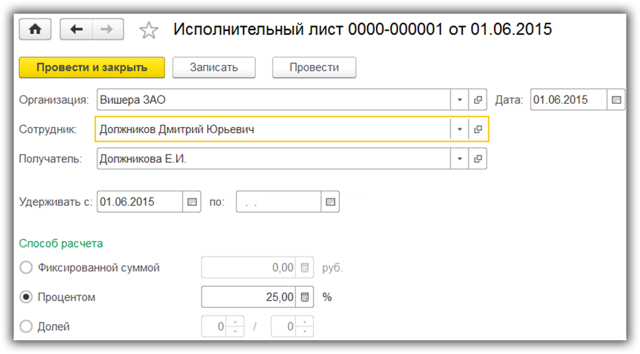 Период удержания и способ расчета заполняются согласно полученному организацией исполнительному документу. Если окончание периода не указывать, программа будет выполнять удержание каждый месяц. Для способа расчета предусмотрено три варианта: процентом, долей или фиксированной суммой.