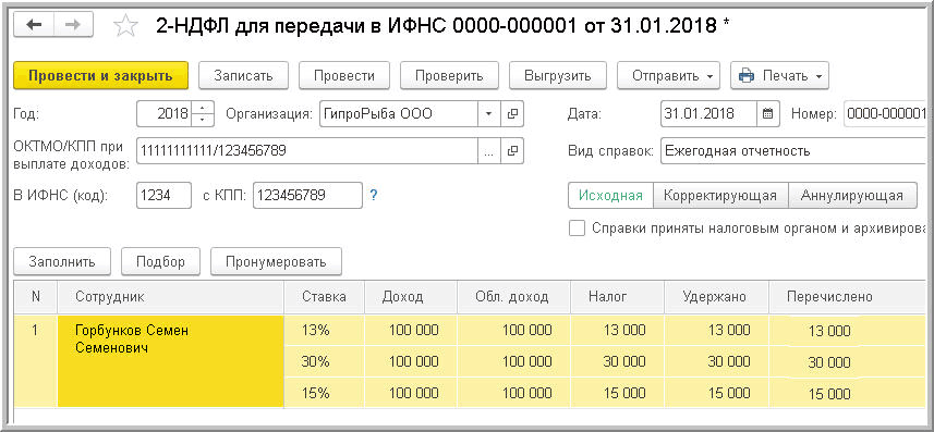 Соответственно, в январе исчислен НДФЛ в размере: 13 000 руб., 15 000 руб. и 30 000 руб (рис. 2).