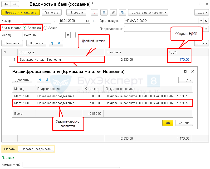 Шаг 2. Зайдите в расшифровку суммы к выплате и скорректируйте сумму, а также удалите информацию об НДФЛ к перечислению.