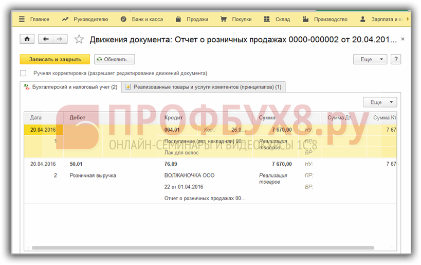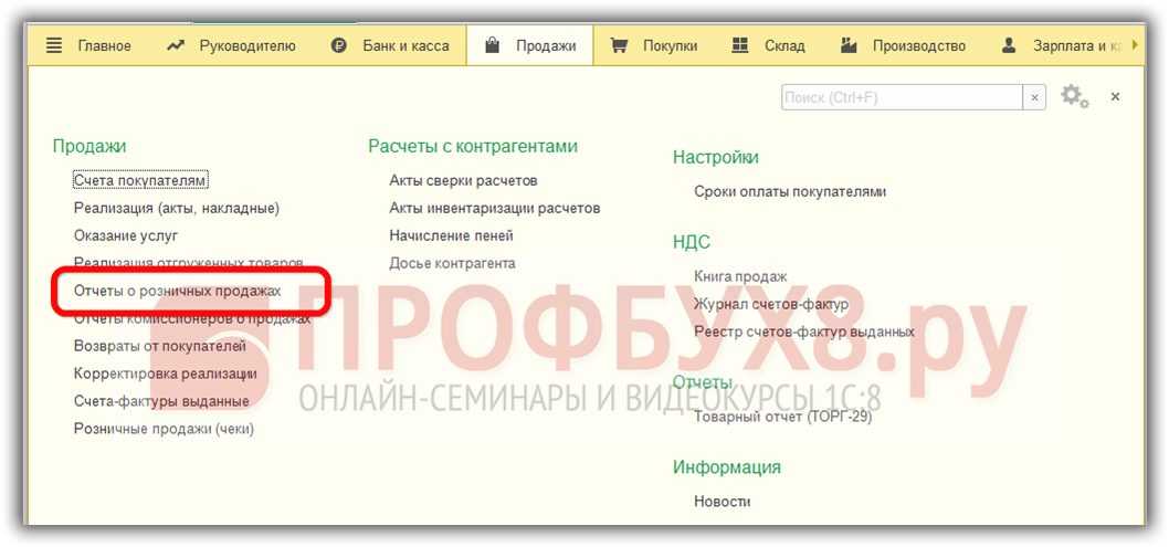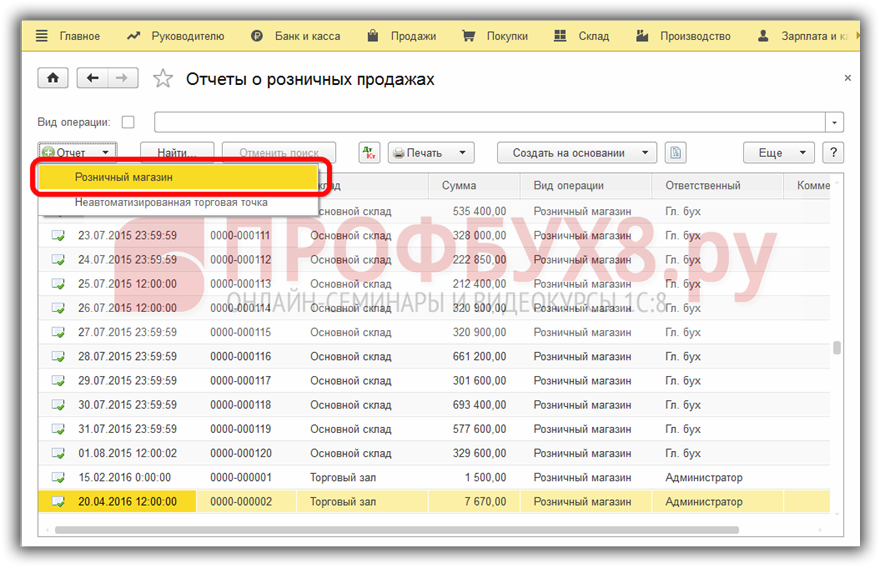 В розничной торговле операции по продажам отражаются документом Отчет о розничных продажах:
