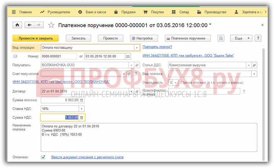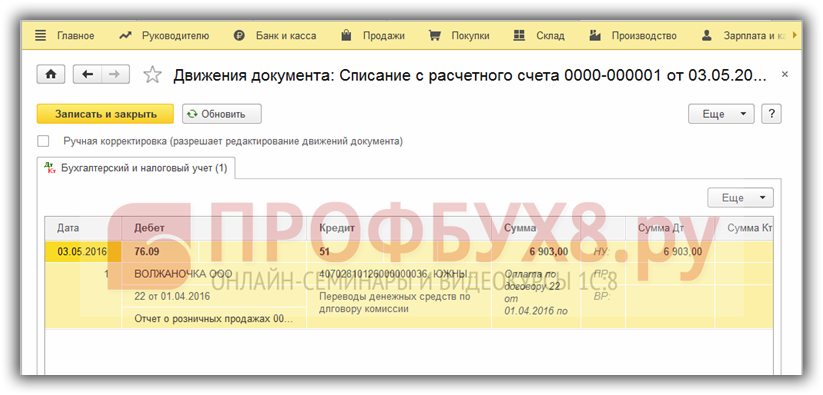 Проверяем заполнение документа. После проведения Банковской выписки в 1С закроется задолженность перед комитентом: