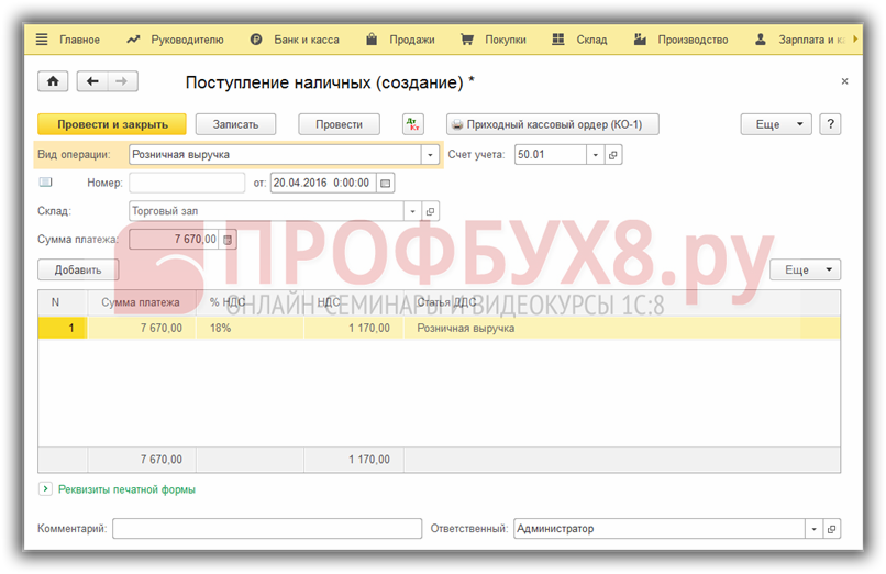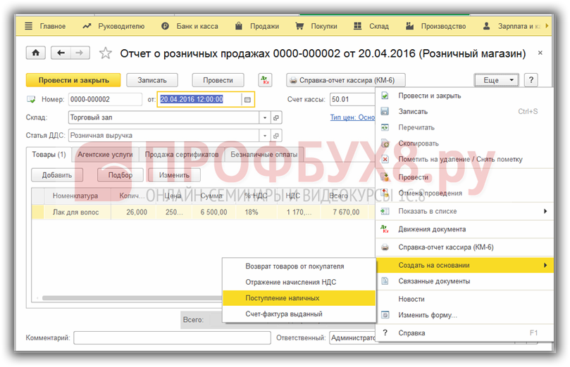 На основании документа Отчет о розничных продажах сформируем документ Поступление наличных: