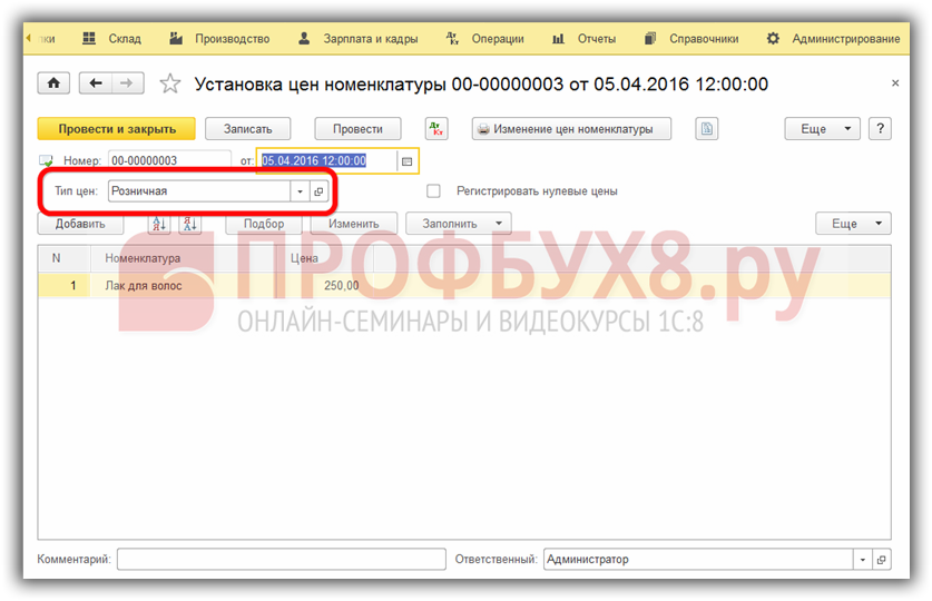 Для продажи товара в розницу необходимо установить тип цены документом Установка цен номенклатуры в разделе Склад – Цены: