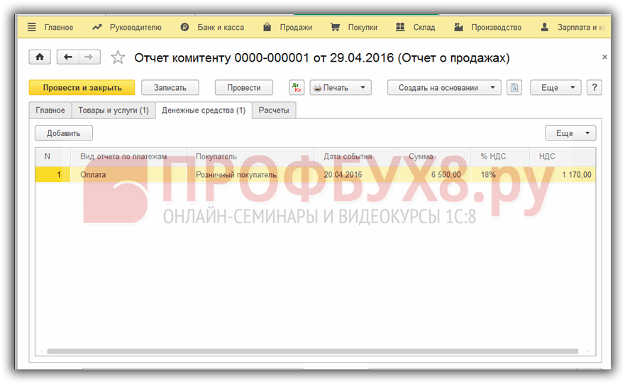 Закладку Денежные средства заполняем, выбрав соответственный вид оплаты для розницы — оплата и покупателя – Розничный покупатель: