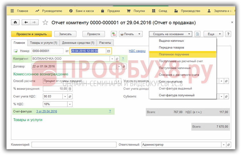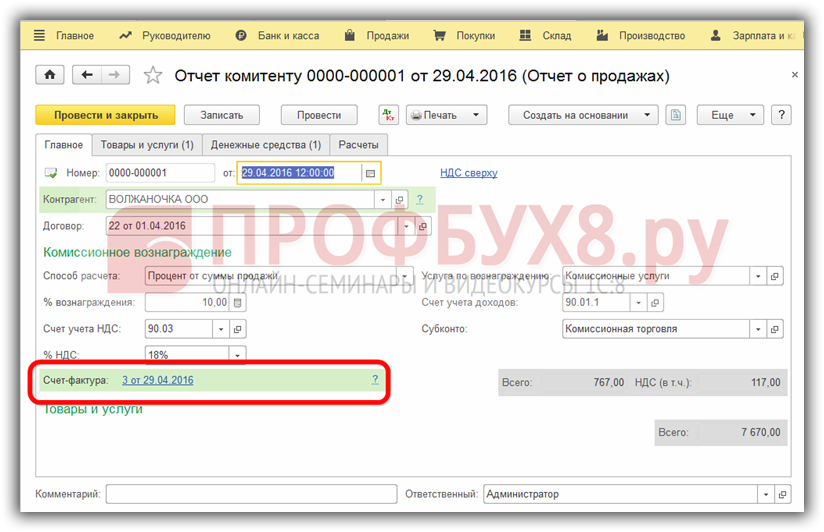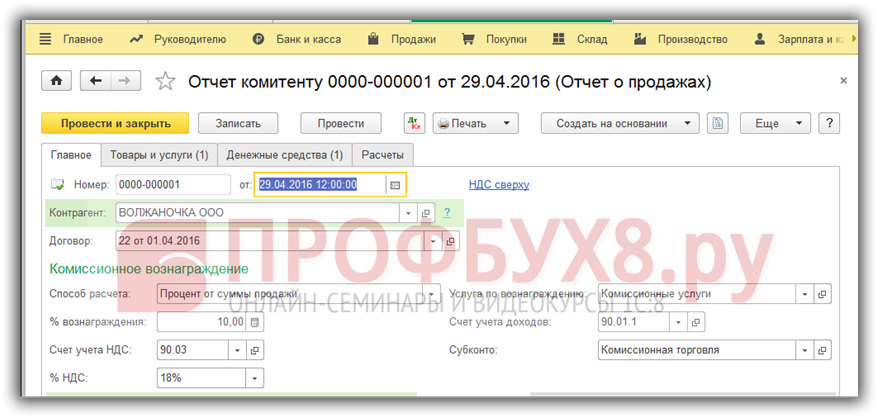 Заполняем закладку Главное, выбрав комитента и договор с ним, указав способ расчета комиссионного вознаграждения, в соответствии с договором: