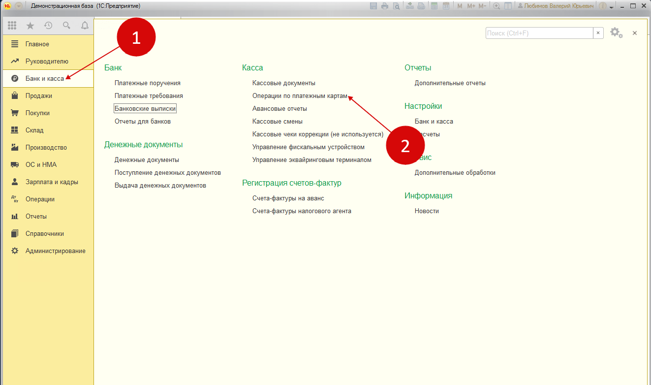 - Переходим в секцию «Банк и касса», после входим в раздел операций по платежным карточкам.