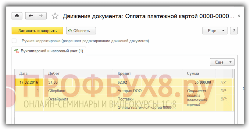 Оплата покупки платежной картой в 1С 8.3 Бухгалтерия 3.0