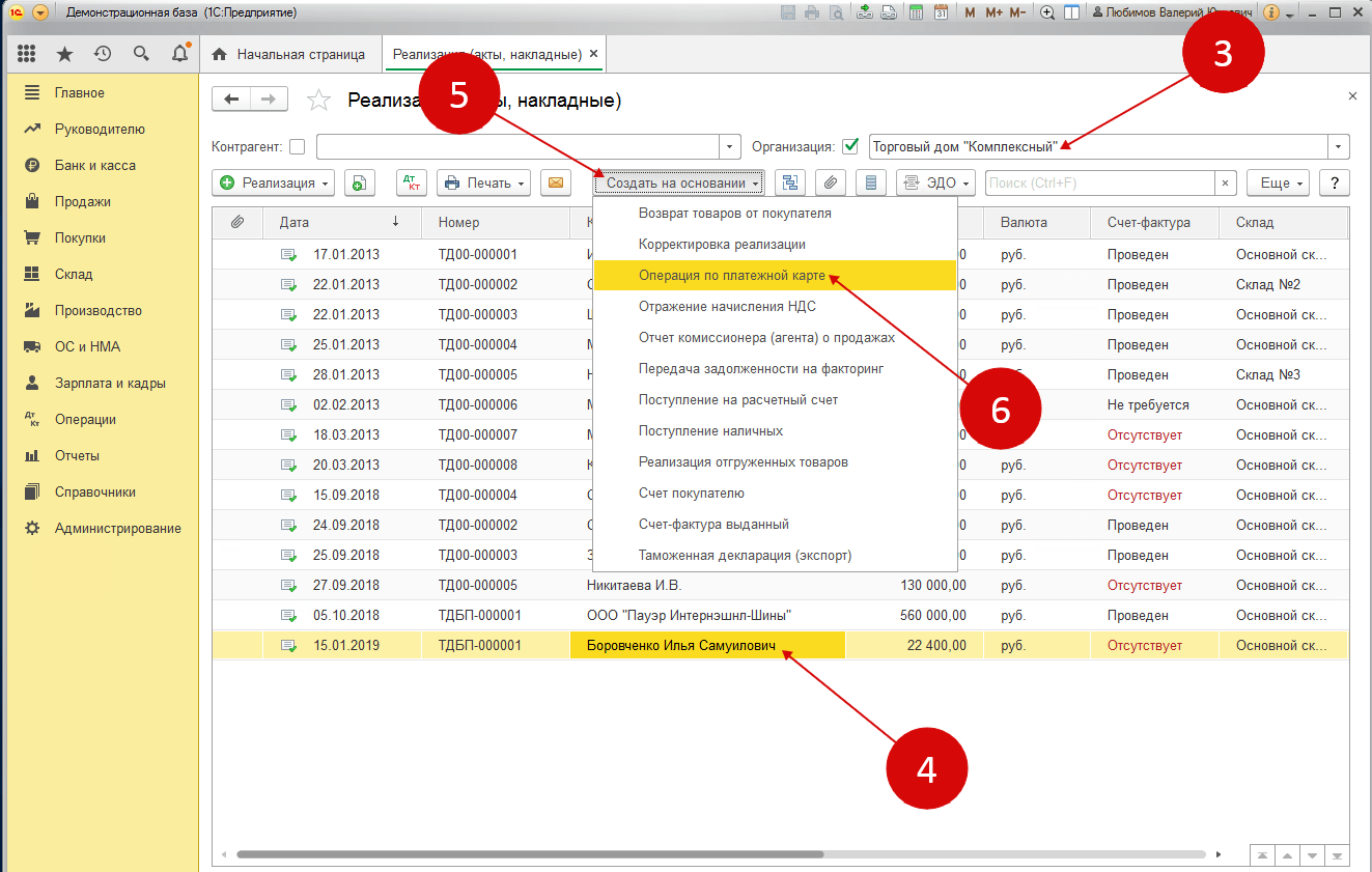 В окне продаж укажите вашу организацию (3), кликните один раз мышкой на продаже (4), по которой была оплата картой, нажмите кнопку «Создать на основании» (5) и выберете пункт «Операция по платежной карте» (6). Откроется операция эквайринга.
