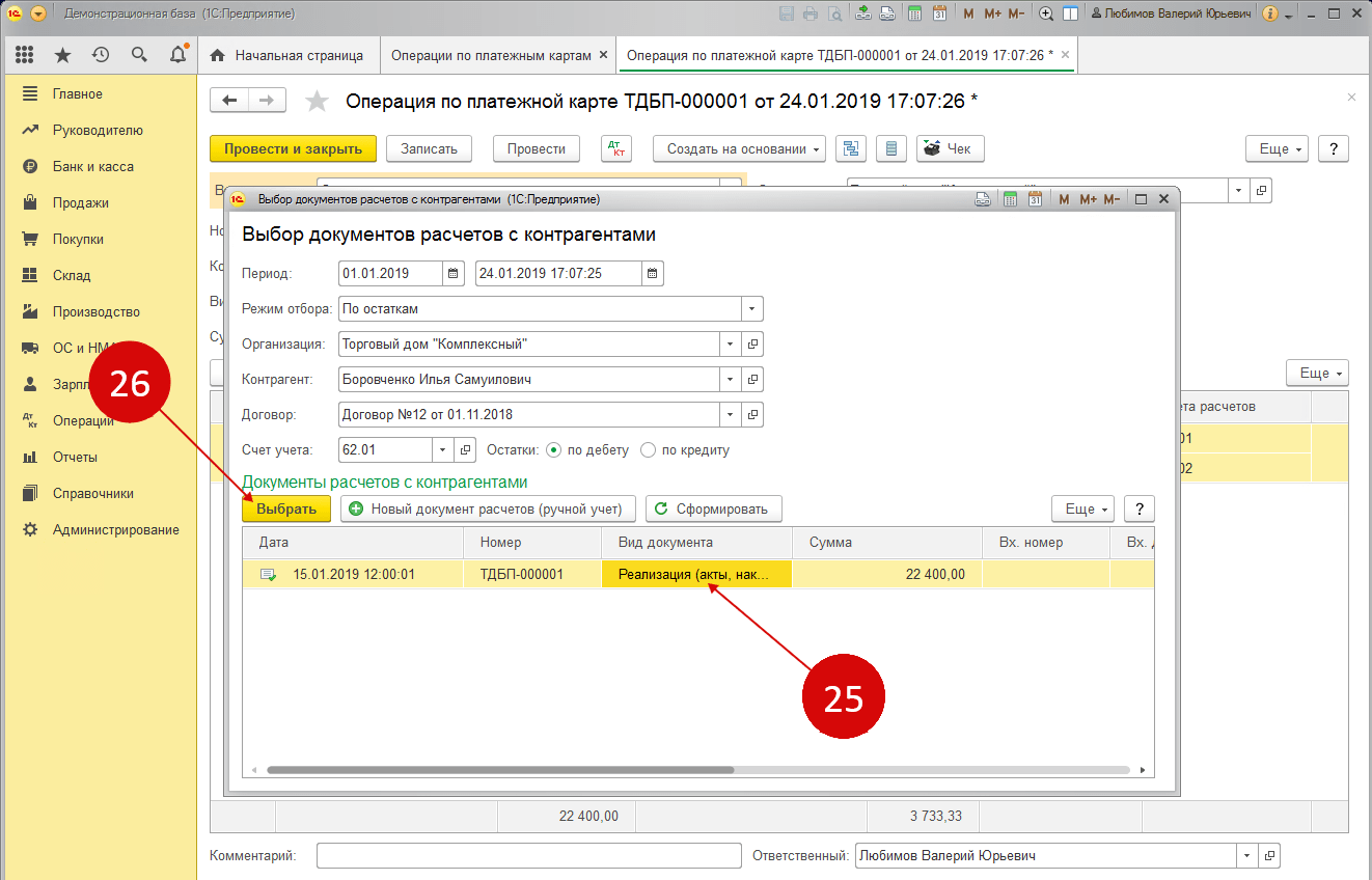 В открывшемся окне выберете из списка нужный документ (25) и нажмите кнопку «Выбрать» (26). Теперь оплата привязана к документу реализации.