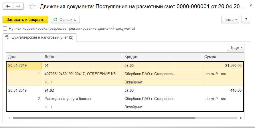 После чего в 1С 8.3 закрывается задолженность банка – эквайера и формируется проводка по услугам банка по эквайрингу. Движение по документу будет следующим: