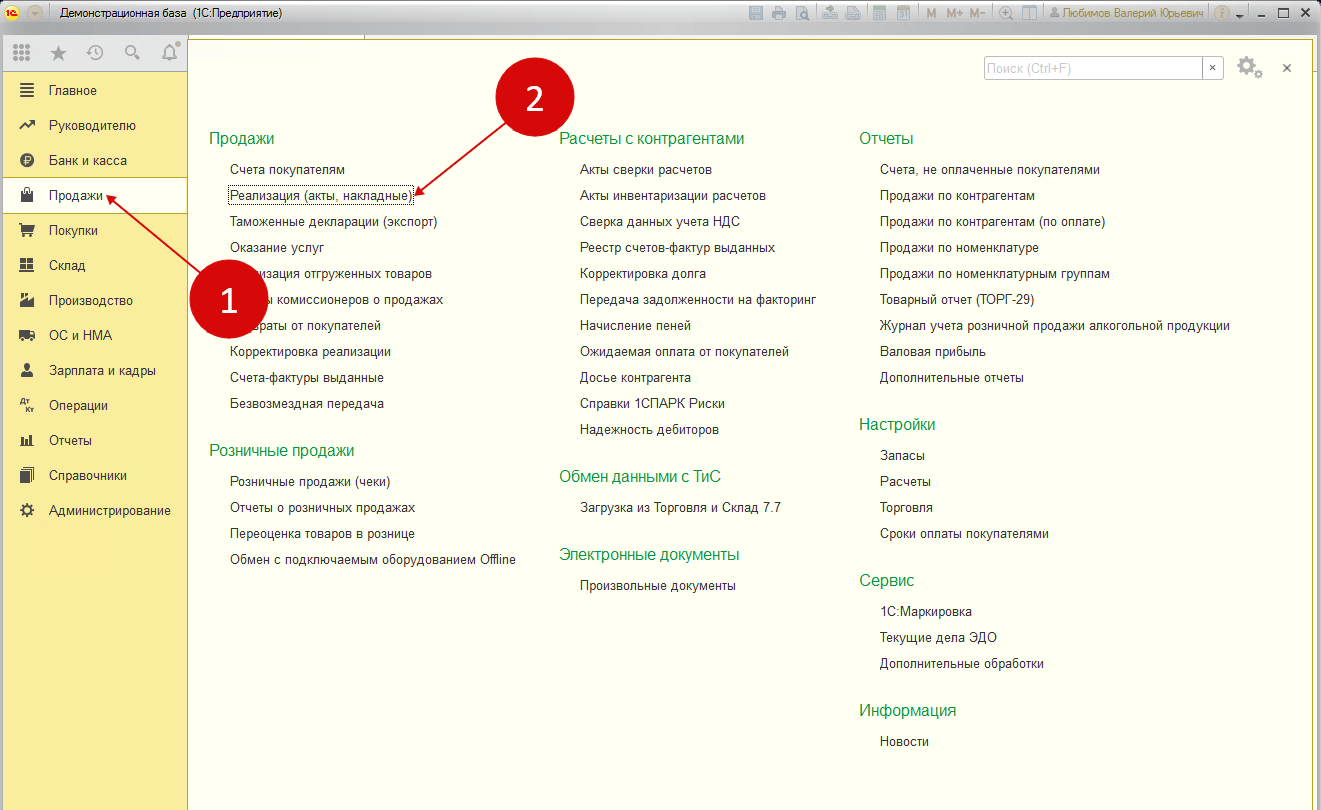 В предыдущей главе мы рассказали, как в 1С 8.3 вручную создать операцию по эквайрингу. Но если в программе уже создан документ продажи, по которому покупатель делает оплату, то проще оформить операцию по эквайрингу от документа продажи. Для этого зайдите в раздел «Продажи» (1) и кликните на ссылку «Реализация (акты, накладные) (2). Откроется окно реализаций.
