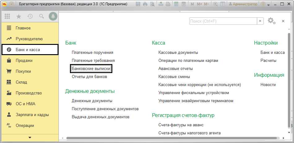 Оплаты от потребителей станут копиться на счёте 57.03, пока банк не зачислит их в нашу пользу. Документ на зачисление создаётся различными вариантами — при загрузке выписок от клиент-банка и самостоятельным вводом через раздел «Банк и касса-Банк» выписки.