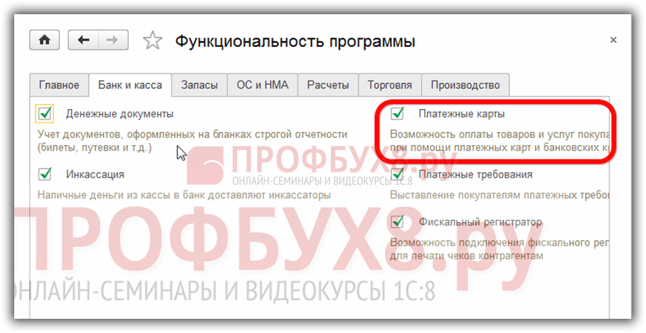 Зайдя во вкладку «Банк и касса» необходимо поставить отметку напротив пункта «Платежные карты», если он не подсвечен и горит серым, значит, данный функционал подключен в программе по умолчанию и уже работает.