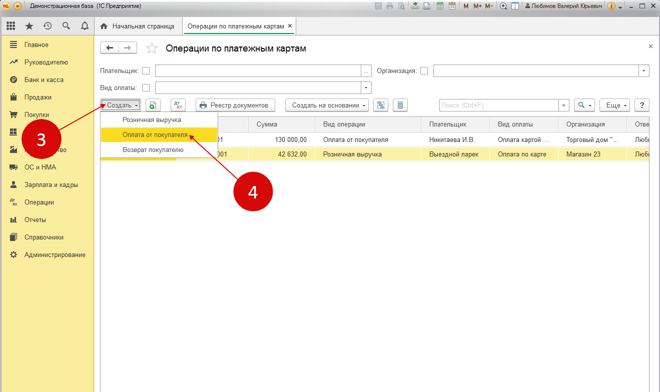В открывшемся окне нажмите кнопку «Создать» (3) и выберете пункт «Оплата от покупателя» (4). Откроется форма для создания оплаты.
