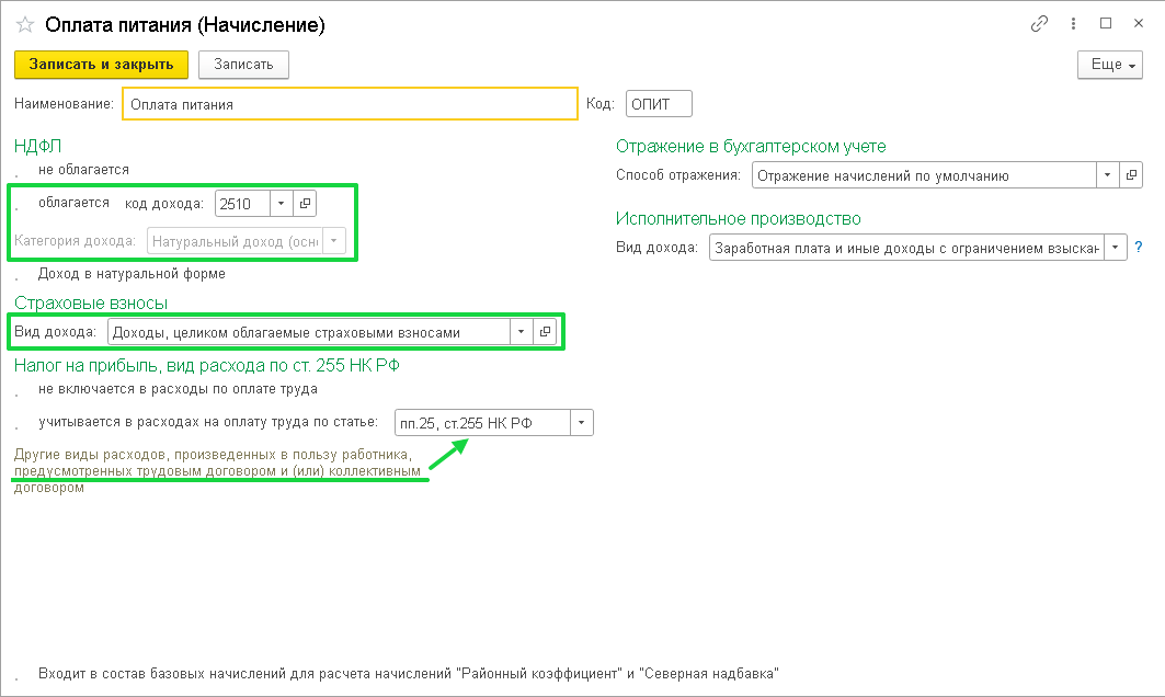 Вид начисления, используемый для начисления стоимости питания в пределах установленного лимита, настраивается в основном таким же образом как и в , но укажите код дохода по НДФЛ – 2510 «Оплата за налогоплательщика товаров, работ, услуг или имущественных прав, в том числе коммунальных услуг, питания, отдыха, обучения в его интересах».