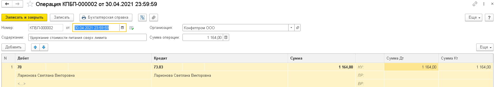 Регистрация суммы удержания оплаты питания (сверх лимита) в бухгалтерском учете производится с помощью документа Операция (Операции — Операции, введенные вручную — Создать — Операция). На сумму удержания создается проводка по дебету счета 70 и кредиту счета 73.03 «Расчеты по прочим операциям» .