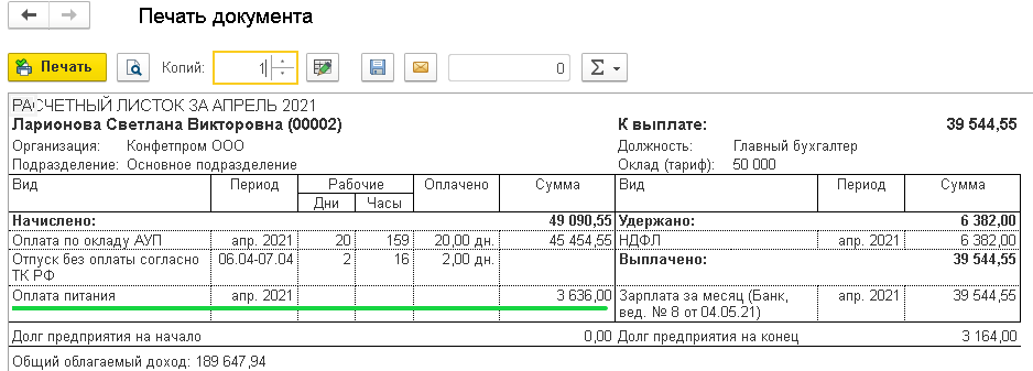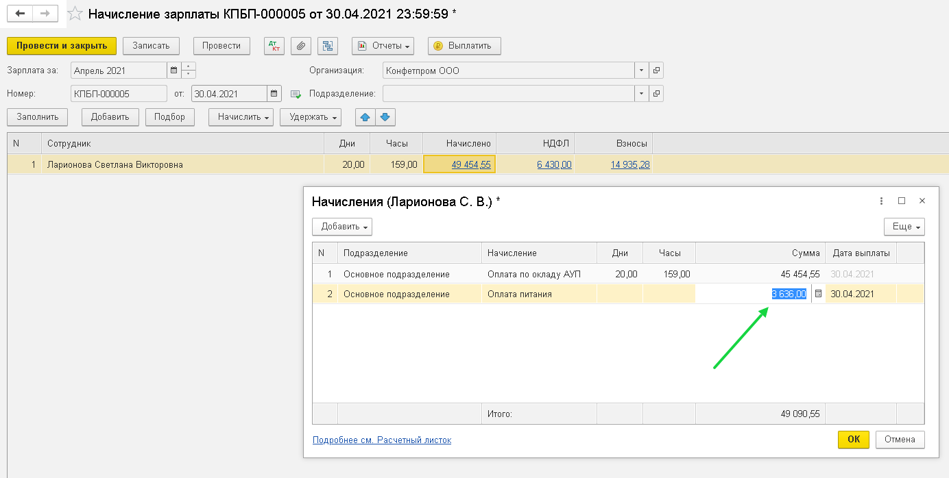 При начислении зарплаты за апрель 2021 г. в документе Начисление зарплаты автоматически начислена и сумма за питание в пределах установленного лимита (4000 руб.) . В апреле 2021 г. сотрудник фактически отработал 20 рабочих дней (при норме 22 рабочих дней). В связи с этим питание будет оплачено работодателем в размере: 4000 руб. / 22 дней * 19 дней = 3636 руб. Сумму в документе корректируем вручную.
