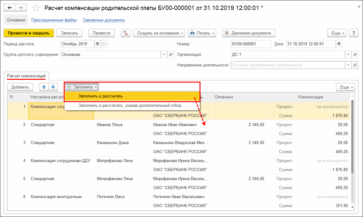 По кнопке Заполнить и рассчитать,расположенной на закладке Расчет компенсаций, табличная часть документа будет автоматически заполнена списком детей, для каждого ребенка будет указана настройка расчета, плательщик, счет плательщика, процент и сумма компенсации. В зависимости от установленного в табличной части также для каждого ребенка указывается:
