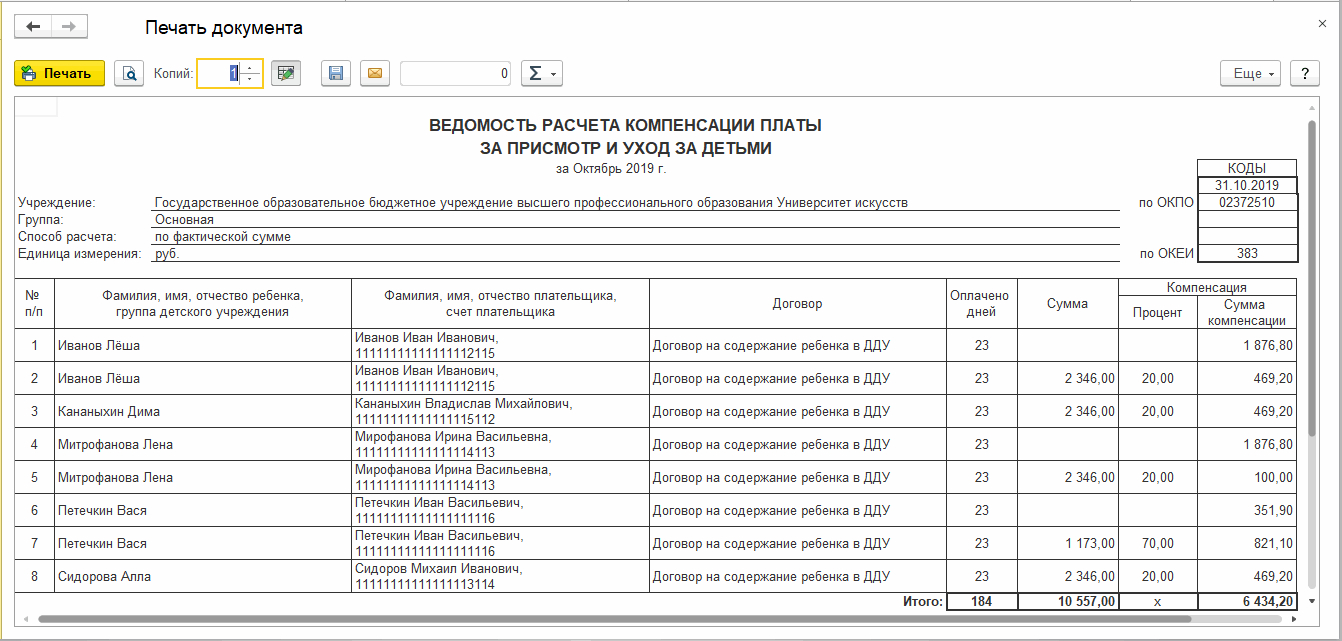 Таким образом, одним документом Расчет компенсации родительской платы будет рассчитана компенсация по всем видам настроек, указанных по детям.