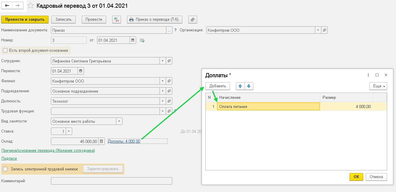 Если оплату стоимости питания необходимо начислять сотруднику в плановом порядке (ежемесячно в течение определенного периода времени), то это возможно с помощью документов кадрового учета: Прием на работу или Кадровый перевод (Зарплата и кадры — Кадровые документы). При назначении указывается плановый размер (сумма) стоимости питания (в нашем примере — 4000 руб.). При заполнении документа Начисление зарплаты в него будет автоматически внесена строка по начислению оплаты стоимости питания и плановый размер стоимости питания, который при необходимости корректируется вручную .