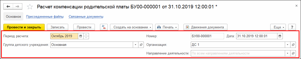Дата документа – указывается дата расчета компенсации родительской платы.
